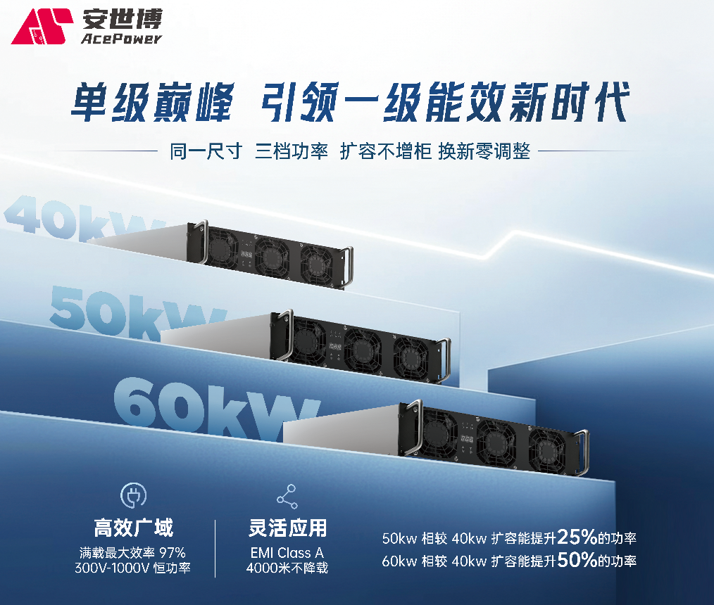 G3系列“扩容不增柜,换新零调整”的核心优势,源于安世博对行业的深刻洞察与创新。其三款功率模块40/50/60kW统一尺寸,接口兼容,同一机柜可灵活配置,运营商无需大改设施即可实现功率升级,大幅降低场地租金、机柜采购及施工改造等成本。