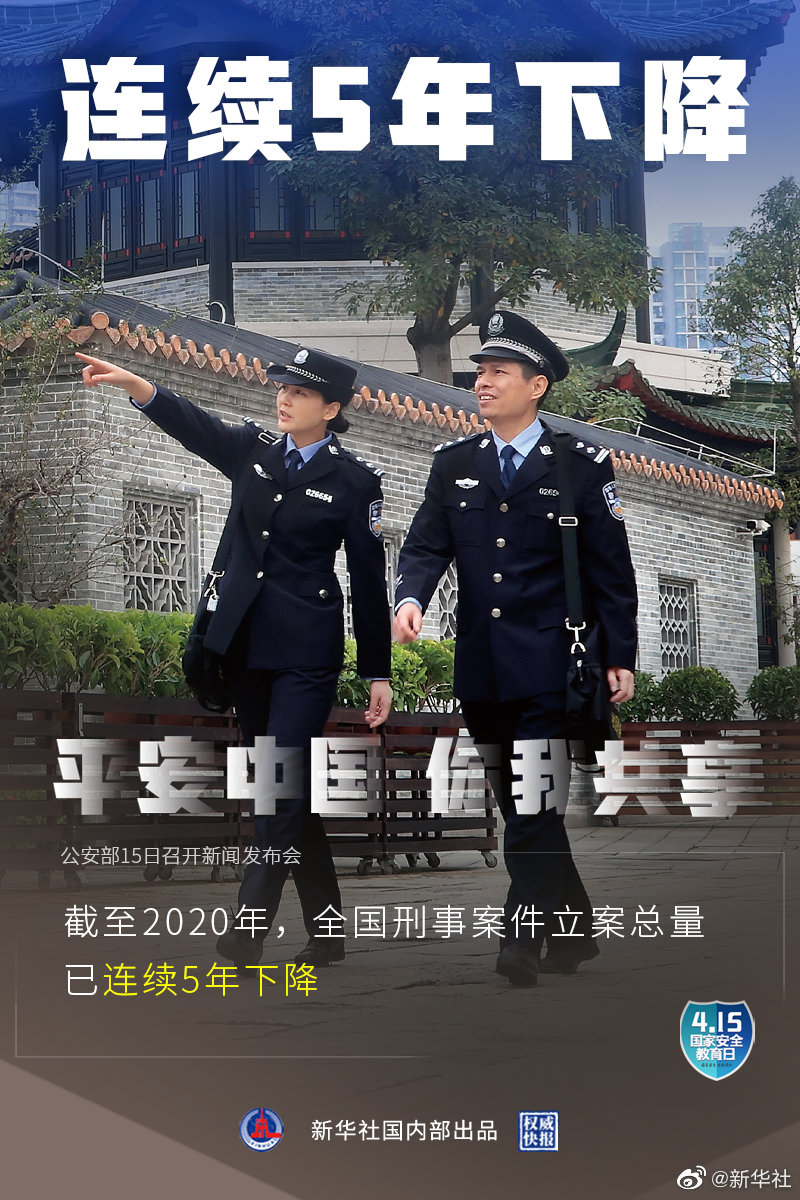 4月15日是第六個(gè)全民國(guó)家安全教育日,公安部15日召開新聞發(fā)布會(huì)介紹:2020年全國(guó)群眾安全感為98.4%,全國(guó)居民對(duì)社會(huì)治安滿意度達(dá)83.6%。截至2020年,全國(guó)刑事案件立案總量連續(xù)5年下降,八類主要刑事案件數(shù)和查處治安案件數(shù)連續(xù)6年下降。(記者熊豐,海報(bào)設(shè)計(jì)張晨光)