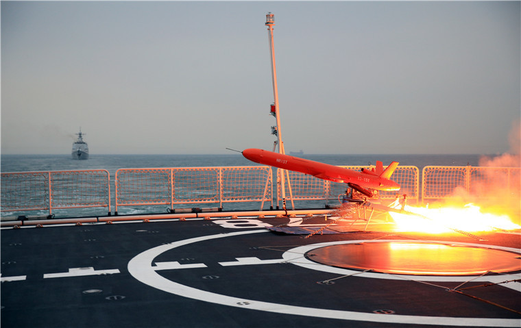 The guided-missile frigate Yangzhou (Hull Number 578) launches an aerial target drone during a realistic training exercise. A destroyer flotilla with the East China Sea Fleet under the PLA Navy organized its guided-missile destroyers Zhengzhou and Changchun and guided-missile frigate Yangzhou to perform realistic training in an undisclosed area of the East China Sea from March 29 to 31, 2016. During the exercise, the sailors carried out over ten training subjects including live-fire strike at maritime targets, air defense and anti-missile operations, comprehensive offensive and defensive operations and so on.