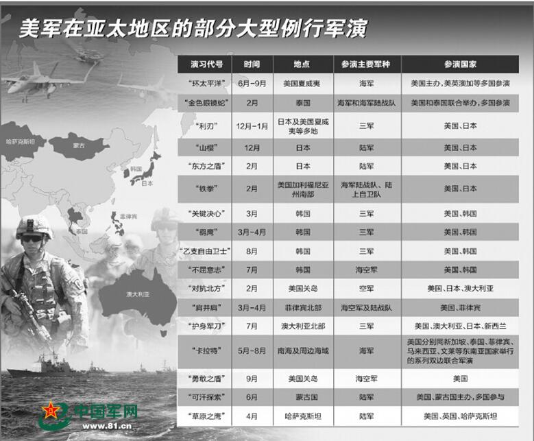 進入21世紀以來,美軍在亞太安全領域進入了“軍演偏愛”時代,尤其是軍演類型多元化、頻度繁密化、功能戰(zhàn)略化的特點日益突出,成為美塑造力量存在的主要手段。2016年,美國在亞太地區(qū)主導的聯(lián)合軍演繼續(xù)保持高密度。據統(tǒng)計,當前美軍每年僅在西太平洋地區(qū)進行的例行性大型軍演就有十余項,各類軍演總數(shù)高達1500余場次,這是冷戰(zhàn)思維和霸權思維的具體表現(xiàn),嚴重影響著亞太地區(qū)局勢的穩(wěn)定。