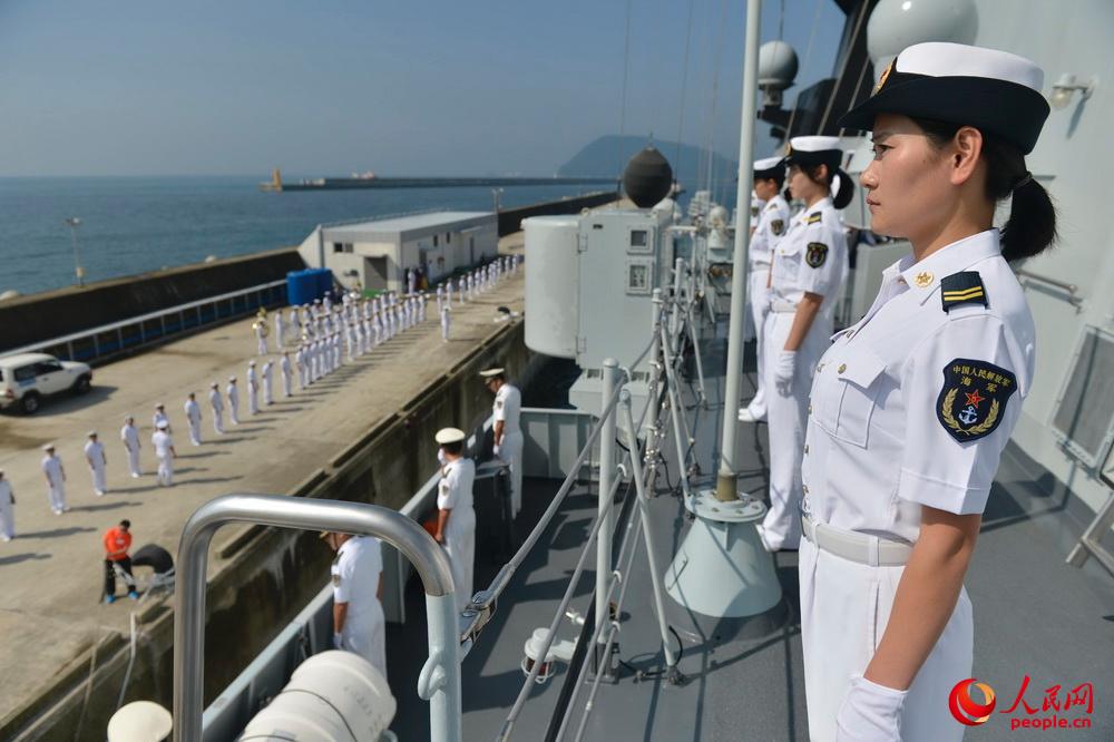 大慶艦靠釜山碼頭時(shí)艦艇女兵整齊列隊(duì)。張海龍攝