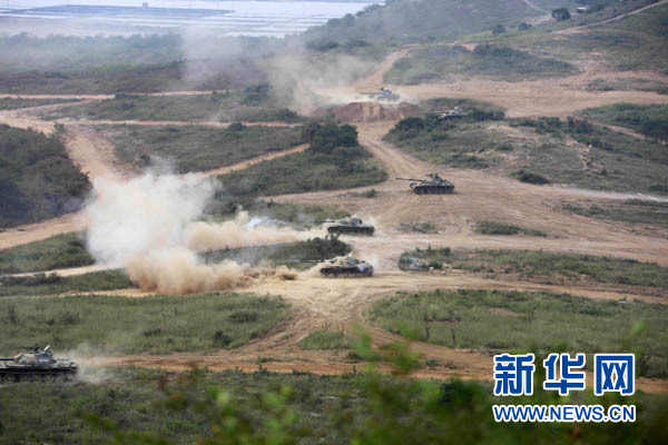 ????演習(xí)中,陸軍第39集團(tuán)軍某紅軍旅坦克分隊向“敵”發(fā)起進(jìn)攻(2015年9月18日攝)。