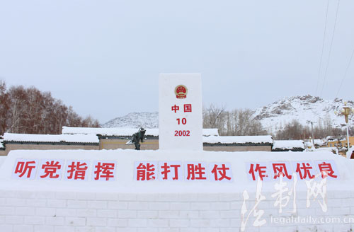 圖為2016年12月29日,新疆阿勒泰邊防支隊(duì)汗德尕特邊防派出所官兵完成“聽(tīng)黨指揮 能打勝仗 作風(fēng)優(yōu)良”雪雕作品