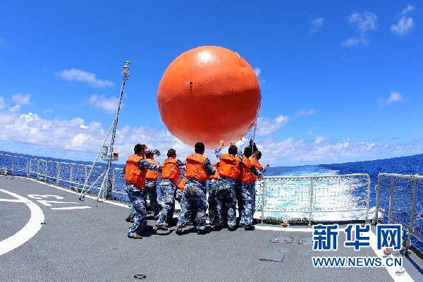 2月19日,在海上現(xiàn)場反擊演練中,長沙艦艦員在飛行甲板上向指定海域布放模擬“敵艦”的漂浮靶標(biāo)。