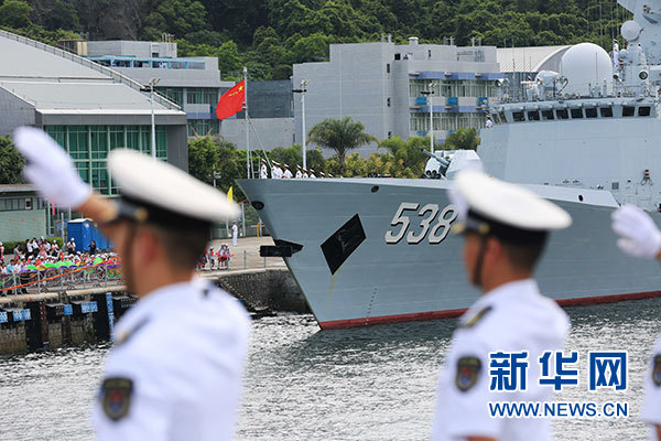 7月7日,海軍銀川艦駛?cè)胂愀郯捍薮a頭。當(dāng)日,正在執(zhí)行跨區(qū)機(jī)動(dòng)訓(xùn)練任務(wù)的中國人民解放軍海軍航母編隊(duì)抵達(dá)香港,參加香港回歸祖國暨中國人民解放軍進(jìn)駐香港20周年慶祝活動(dòng),受到香港特區(qū)政府和民眾熱烈歡迎。新華社記者 曾濤 攝