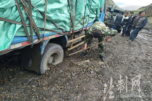????連日來,受強(qiáng)降雨天氣影響,通往西藏山南市錯(cuò)那縣卡達(dá)鄉(xiāng)道路因山體塌方和泥石流損毀嚴(yán)重,7月23日中午12時(shí),西藏邊防總隊(duì)山南邊防支隊(duì)卡達(dá)邊防派出所接轄區(qū)居民電話報(bào)警稱:商店運(yùn)貨貨車在返回卡達(dá)鄉(xiāng)途中陷入泥潭,請(qǐng)求派出所救援。接到消息后,該所迅速組織官兵趕往現(xiàn)場(chǎng),并持續(xù)關(guān)注道路情況和受困狀況。到達(dá)現(xiàn)場(chǎng)后,邊防官兵立即展開救援,用十字鎬挖、用手刨、用人推,經(jīng)過2個(gè)小時(shí)的不懈努力,最終成功把陷入泥坑的貨車?yán)觥>仍Y(jié)束后,邊防官兵就近取材把泥坑填平,并設(shè)立警示標(biāo)志,確保后續(xù)車輛順利通過?,F(xiàn)場(chǎng)無(wú)人員受傷,車輛完好。