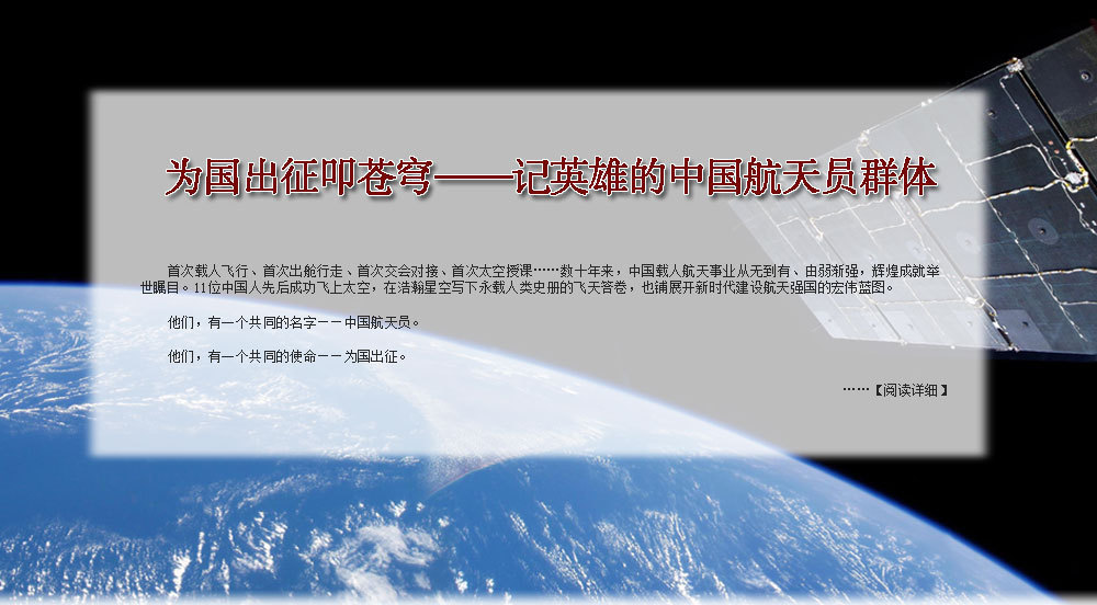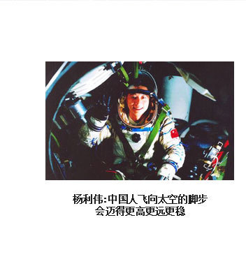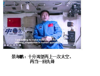 ??? 為了人類的和平與進(jìn)步,中國人來到了太空。2003年10月15日,我搭乘神舟五號飛船,在太空飛行14圈,歷時(shí)21小時(shí)23分,完成了中國首次載人航天飛行。雖然是獨(dú)自在太空飛行,但一想到億萬祖國人民翹首以待,我覺得不是一個(gè)人在飛。于是我拿起太空筆,在工作日志的背面寫上了這樣一句話:“為了人類的和平與進(jìn)步,中國人來到了太空”,并在艙內(nèi)鏡頭前向祖國人民、世界人民展示?!盀榱巳祟惖暮推脚c進(jìn)步”,是中國發(fā)展載人航天事業(yè)的初衷,“中國人來到了太空”既描述了一個(gè)歷史時(shí)刻,也表達(dá)了我為祖國航天事業(yè)感到無比自豪的心情。?