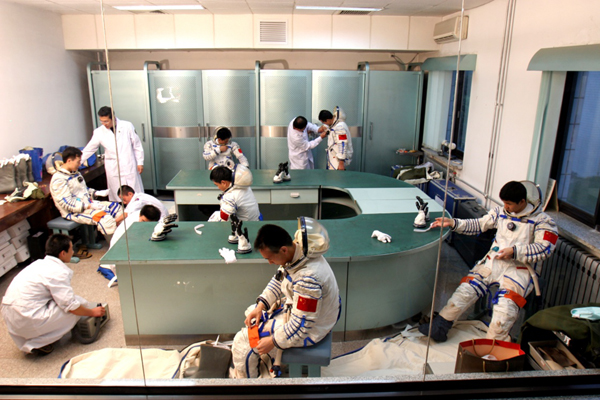 ????2002年6月17日,航天員在進(jìn)行穿脫訓(xùn)練。新華社發(fā)