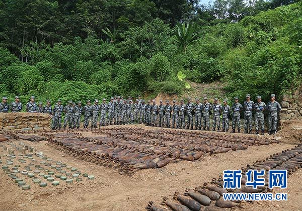 參訓(xùn)官兵到中越邊境麻栗坡某雷場(chǎng)參觀識(shí)別已搜排出的地雷及爆炸物(8月26日攝)。 新華社發(fā)(張輝 攝)