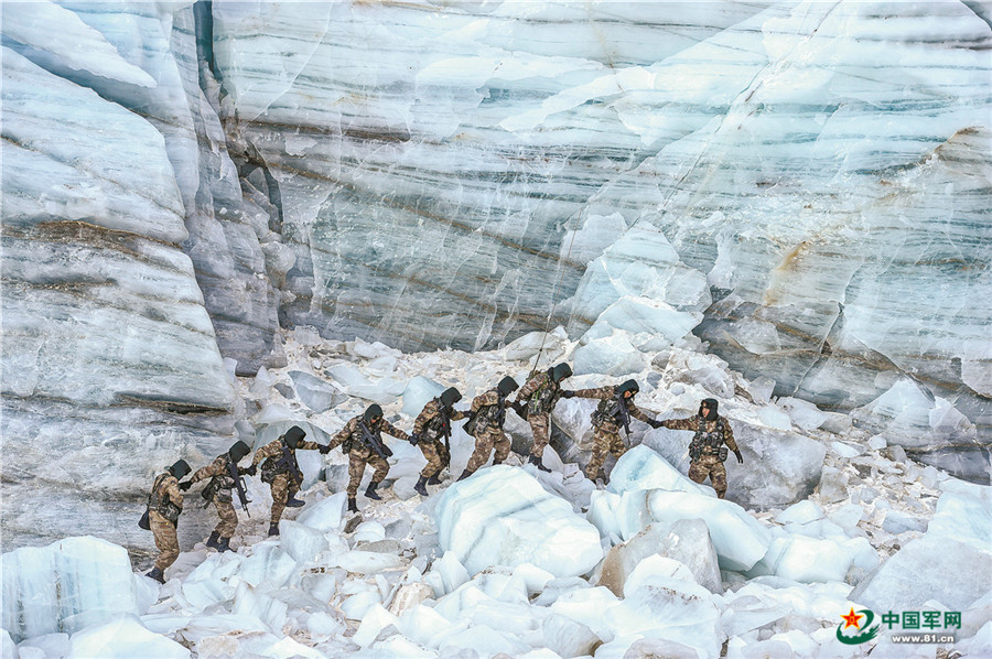 官兵手牽手通過冰川危險(xiǎn)地帶。