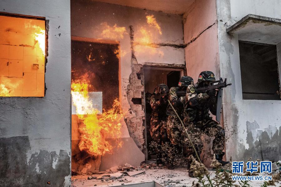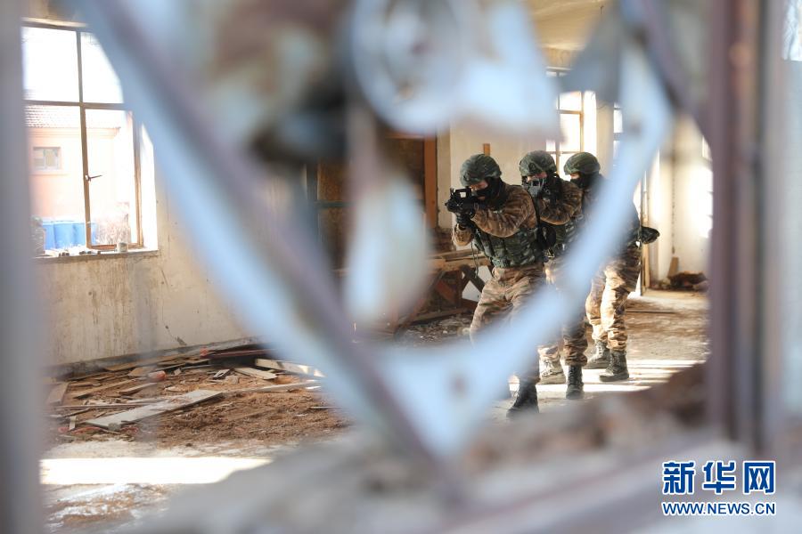 武警第一機(jī)動(dòng)總隊(duì)某支隊(duì)特戰(zhàn)隊(duì)員在進(jìn)行房間搜索訓(xùn)練(12月15日攝)。新華社發(fā)(常龍 攝)