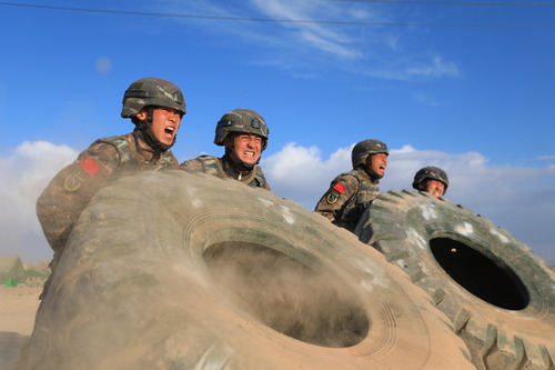 ????武警新疆總隊某機(jī)動支隊特戰(zhàn)一中隊組織官兵進(jìn)行翻輪胎體能訓(xùn)練(10月30日攝)。新華社發(fā)(張文 攝)