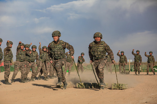 ????武警新疆總隊某機(jī)動支隊特戰(zhàn)一中隊組織官兵進(jìn)行搬運子彈箱體能訓(xùn)練(10月30日攝)。新華社發(fā)(張文 攝)