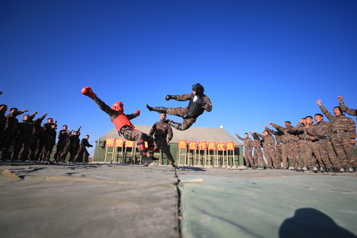 ????武警新疆總隊某機(jī)動支隊特戰(zhàn)一中隊組織官兵開展搏擊訓(xùn)練(10月31日攝)。新華社發(fā)(張文 攝)