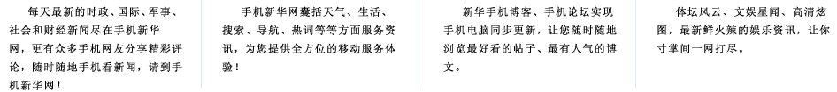 手機(jī)新華網(wǎng)是新華網(wǎng)的手機(jī)無線門戶網(wǎng)站,是中國最具權(quán)威的免費(fèi)手機(jī)新聞網(wǎng)站之一。歡迎各地電信運(yùn)營商以及廣告界、企業(yè)界、商務(wù)界、傳媒界等各界人士與我們聯(lián)系,精誠合作,實(shí)現(xiàn)共贏。電話:010-63070908,E-mail:xhsjb@xinhuanet.com