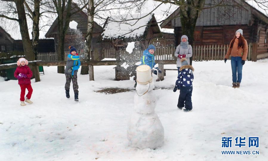 1月24日,孩子們在白俄羅斯首都明斯克郊區(qū)的民族建筑博物館內(nèi)打雪仗。新華社發(fā)(任科夫攝)