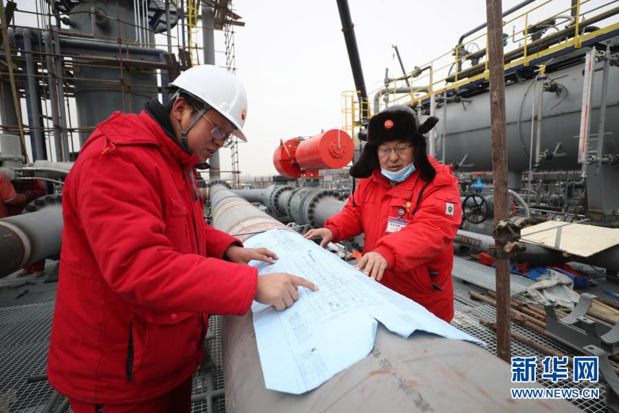 2月3日,在遼河油田雙臺(tái)子儲(chǔ)氣庫(kù)群一期工程現(xiàn)場(chǎng),來(lái)自湖北孝感的工程技術(shù)人員劉單明(左)和同事在現(xiàn)場(chǎng)工作。今年他留在施工現(xiàn)場(chǎng)過(guò)年,確保工期目標(biāo)如期完成。