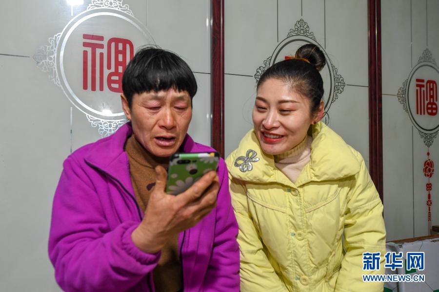 2月9日,在吉林省長(zhǎng)春市農(nóng)安縣楊樹林鄉(xiāng)牛尾巴山村,付寶印的母親鐘士輝(左)與付寶印姐姐付寶賀用手機(jī)與付寶印視頻通話。新華社記者 張楠 攝