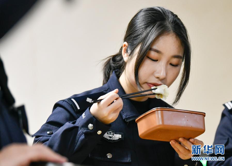 2月11日,在天津市紅橋區(qū)芥園派出所的餐廳,在崗位上過年的楊曉惠品嘗單位準(zhǔn)備的餃子。新華社發(fā)(孫凡越攝)