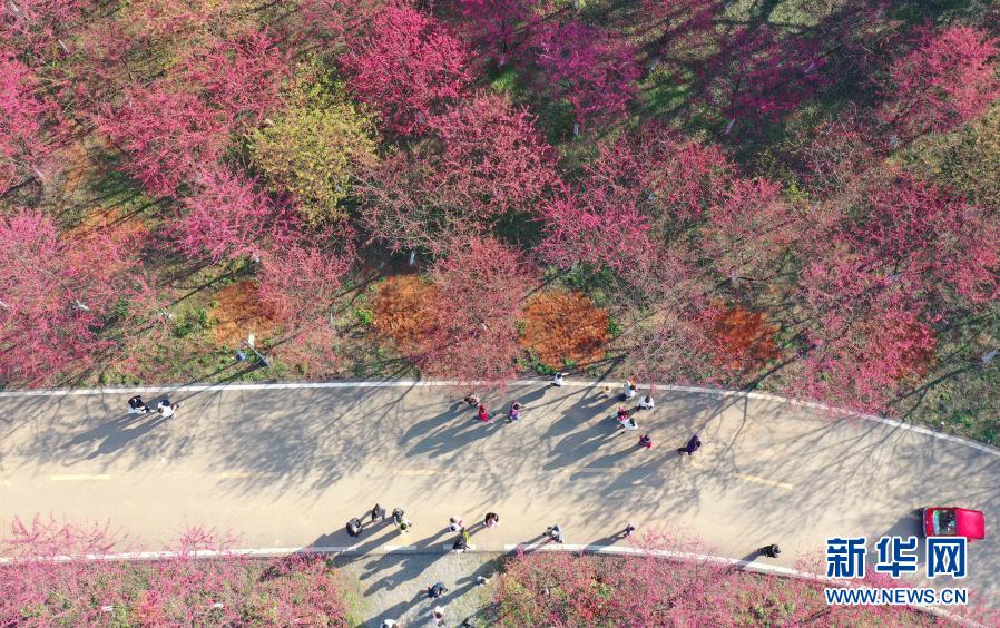 2月14日,游客在湖南省常寧市羅橋鎮(zhèn)櫻花園游玩 (無(wú)人機(jī)照片) 。新華社發(fā)(曹正平 攝)