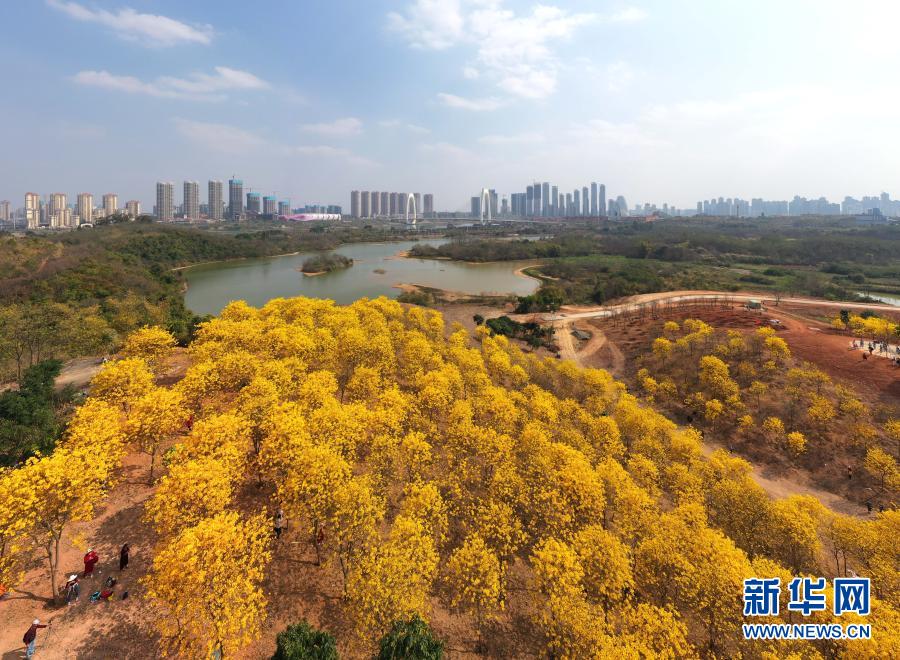 近日,廣西南寧市青秀山風(fēng)景區(qū)黃花風(fēng)鈴木盛放,吸引眾多游人前來觀賞。
