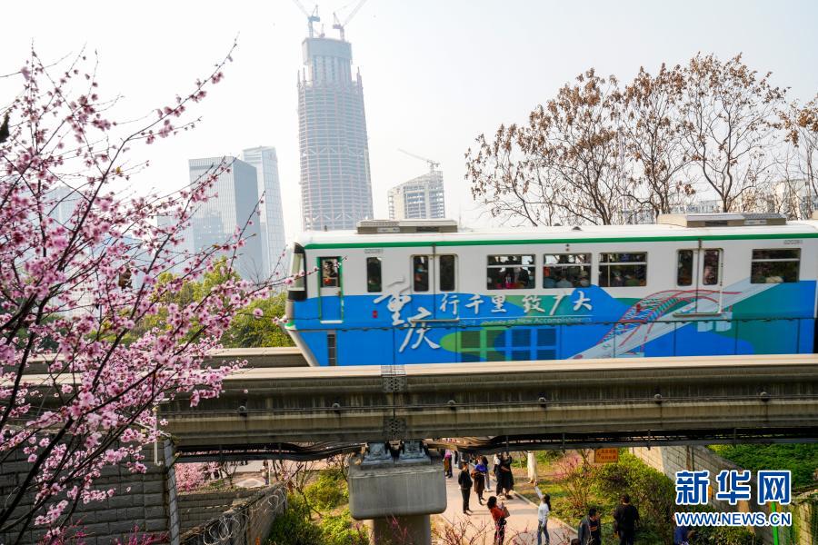 初春時節(jié),重慶氣溫逐漸回暖,暖陽里的山城春意盎然。在重慶軌道交通2號線佛圖關(guān)段,山城步道上的梅花簇簇綻放,單軌列車穿越花海,組成一幅賞心悅目的獨特城市景觀。