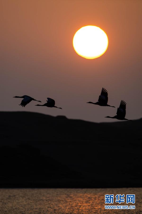 日出時分,黑頸鶴在大山包黑頸鶴國家級自然保護(hù)區(qū)飛翔(2月27日攝)。新華社記者 胡超 攝