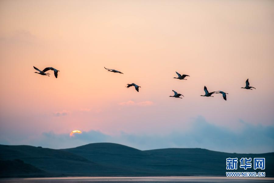 日出時分,黑頸鶴在大山包黑頸鶴國家級自然保護(hù)區(qū)飛翔(2月25日攝)。新華社記者 胡超 攝