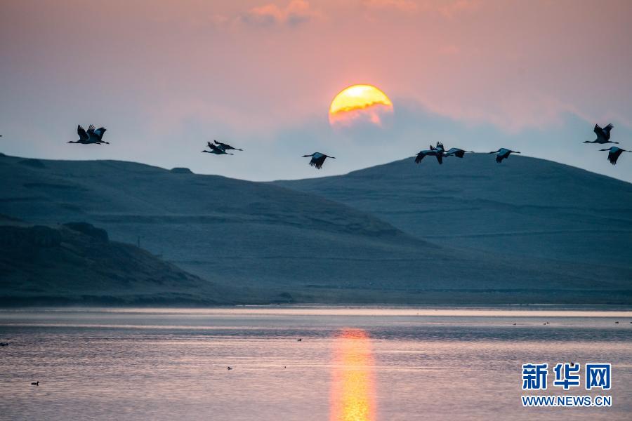 日出時(shí)分,黑頸鶴在大山包黑頸鶴國(guó)家級(jí)自然保護(hù)區(qū)飛翔(2月25日攝)。新華社記者 胡超 攝