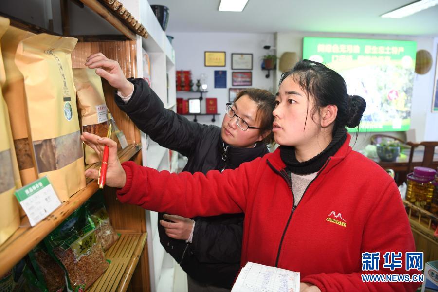 張志菊(前)在自己的土特產(chǎn)店里清點(diǎn)商品(2月26日攝)。