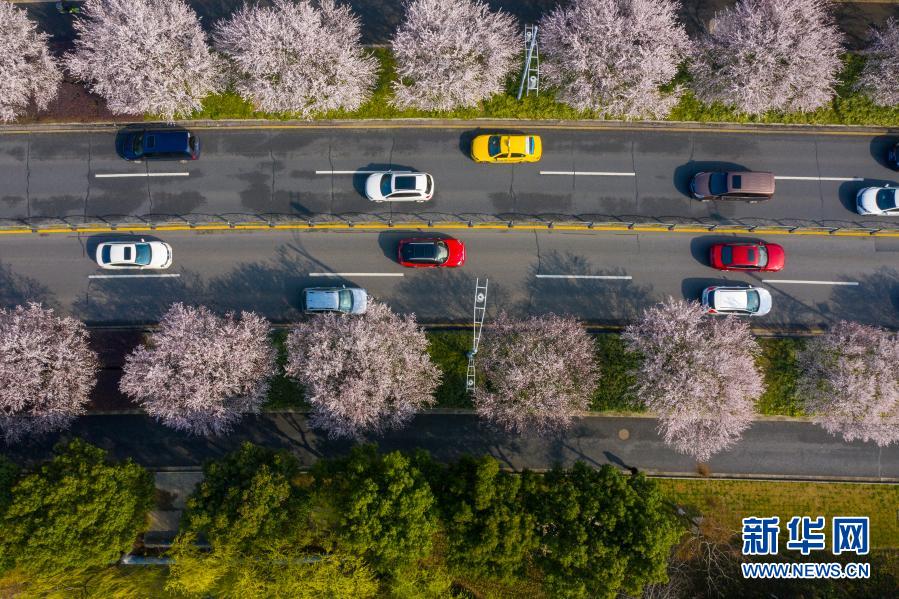 3月2日,汽車行駛在鮮花盛開的江蘇省昆山市馬鞍山路上(無人機照片)。春回大地,各地繁花盛開,春意盎然、生機勃勃。