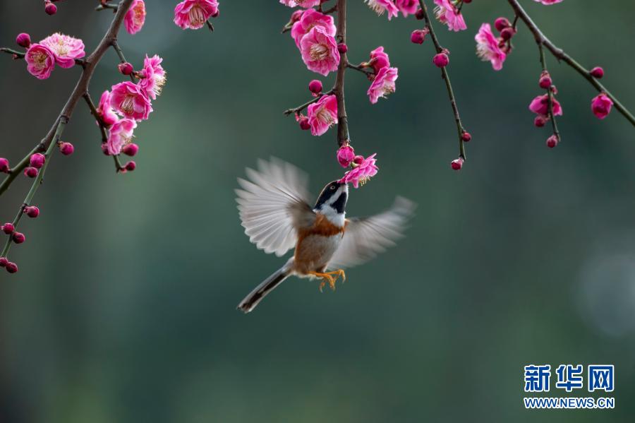 3月2日,在江蘇無(wú)錫管社山莊,小鳥(niǎo)在綻放的梅花下“親吻”花蕊。新華社發(fā)(潘正光 攝)