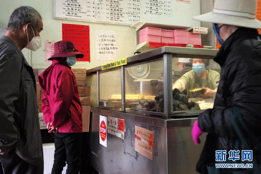 3月3日,人們?cè)诿绹?guó)加利福尼亞州舊金山唐人街一家餐館內(nèi)購(gòu)買餐食。新華社記者 吳曉凌 攝