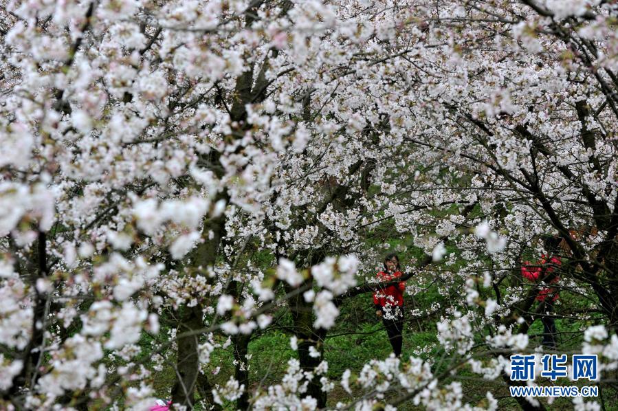 春季里,貴州省貴安新區(qū)紅楓湖畔的櫻花園內櫻花綻放,花海如云似雪,吸引游人踏春賞櫻。