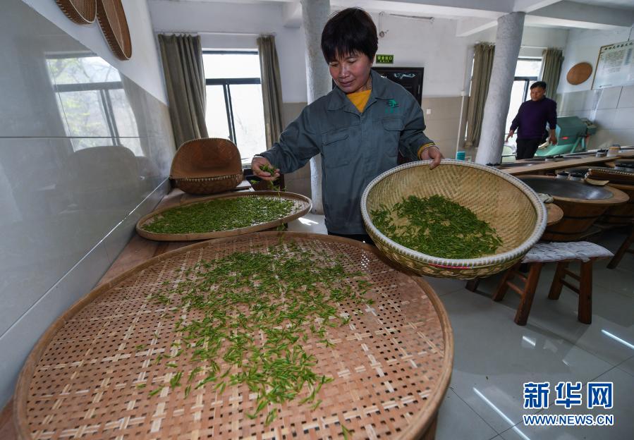 3月12日,在杭州市西湖風景名勝區(qū)滿覺隴村的中國茶葉博物館滿覺隴炒茶中心內,茶農把西湖龍井茶鮮葉進行攤青。