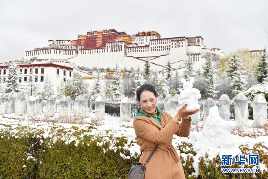 3月14日,在布達拉宮前,一名路人舉起一個雪人留影。