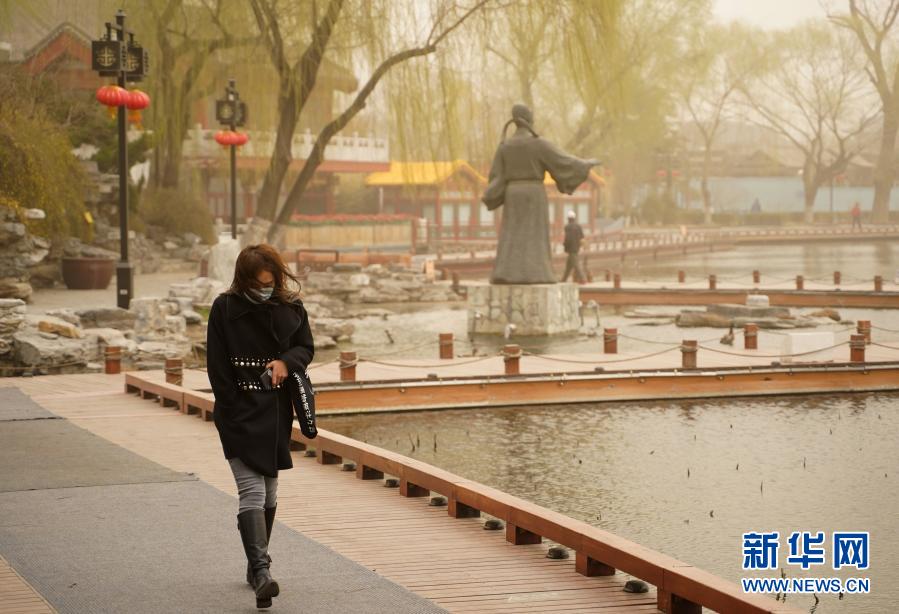 3月15日,市民經(jīng)過(guò)北京西海。當(dāng)日,我國(guó)北方多地出現(xiàn)沙塵天氣。新華社記者 賈浩成 攝