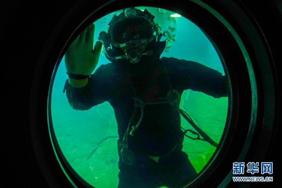 3月15日,在長江水下40多米的白鶴梁題刻無壓容器罩內(nèi),潛水員在對參觀廊道的觀察窗玻璃進(jìn)行清理。新華社記者 劉潺 攝