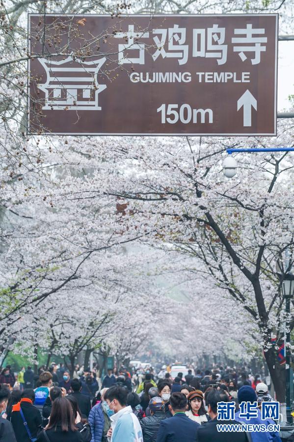 3月16日,市民游客在南京雞鳴寺路觀賞櫻花。