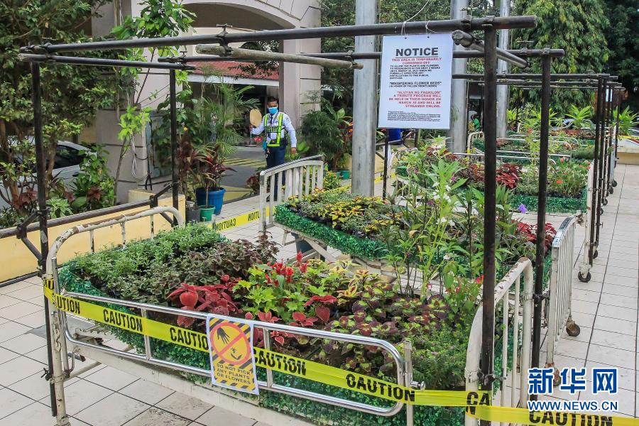 3月18日,在位于馬尼拉的菲律賓大學(xué)附屬菲律賓總醫(yī)院,一名安保人員看向“低語的花床”藝術(shù)裝置。