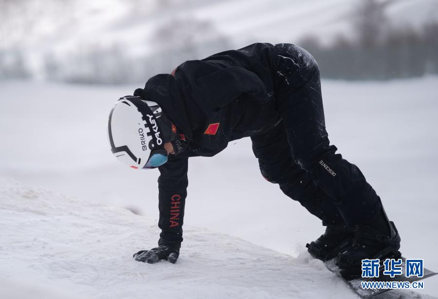3月20日,冬殘奧會國家集訓隊單板滑雪運動員汪志鵬在冬殘奧會訓練基地訓練時摔倒后起身。新華社記者 才揚 攝