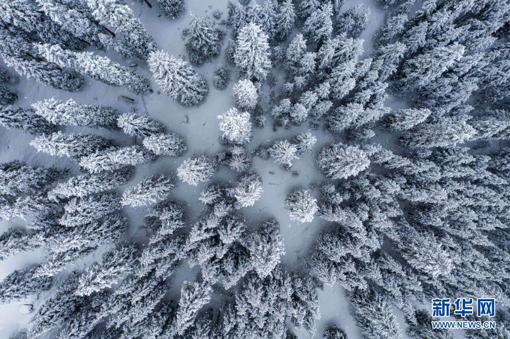 3月30日,大雪降落在新疆沙灣市鹿角灣的雪嶺云杉森林間(無人機(jī)照片)。