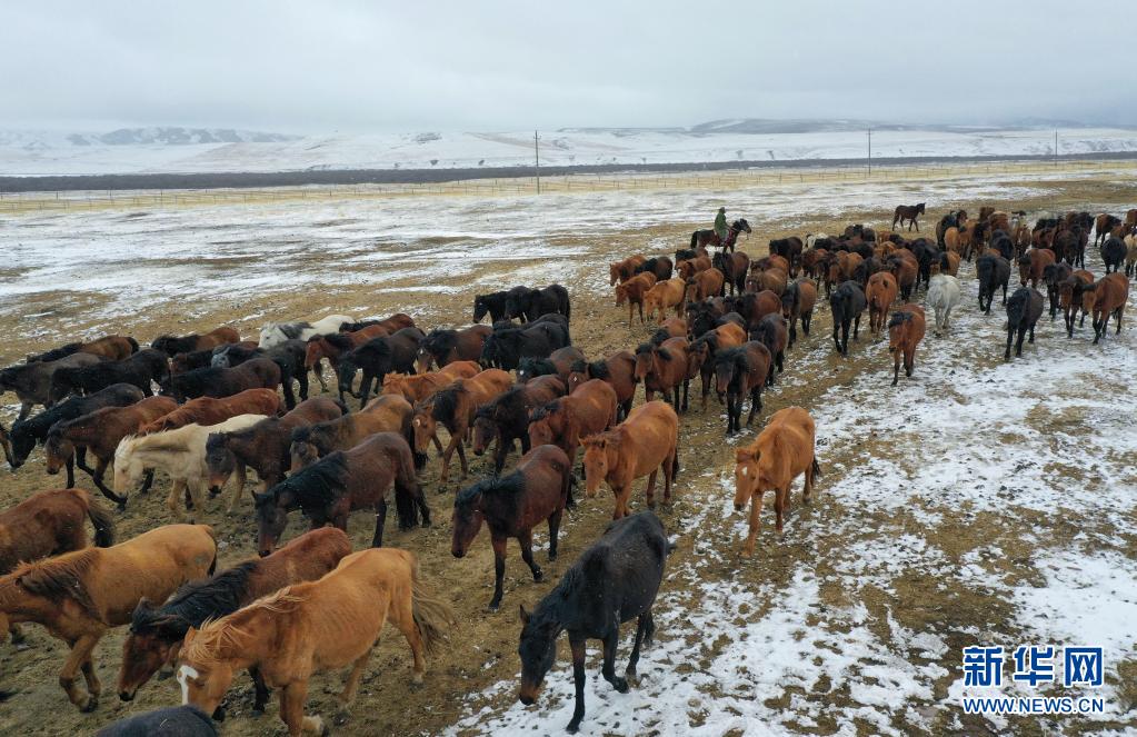 當(dāng)日,受冷空氣影響,位于甘肅省河西走廊中部、祁連山北麓的山丹馬場降雪,馬群在雪原上奔跑覓食,構(gòu)成了一幅壯美高原雪景 。