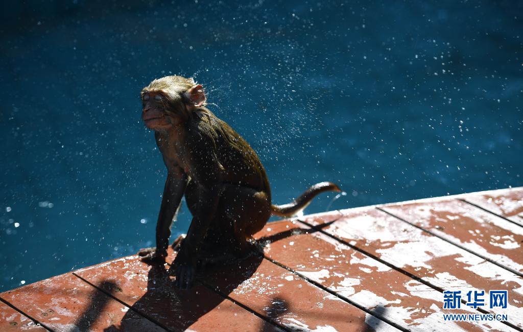 4月4日,南灣猴島保護(hù)區(qū)里的獼猴在上岸后甩去身上的水。