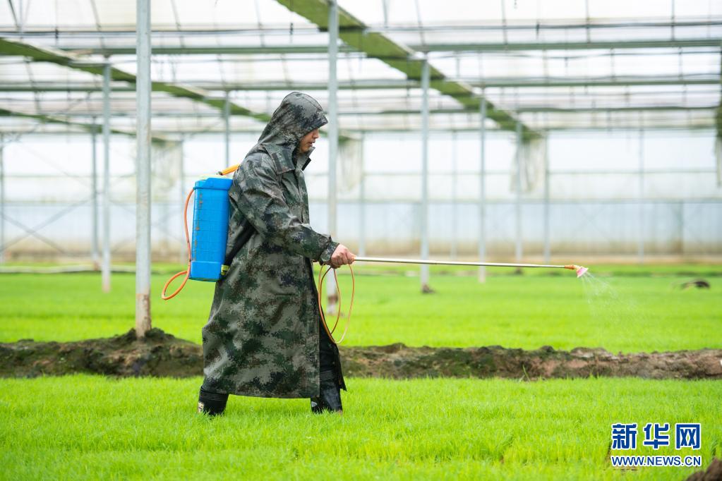 4月5日,在湖南省瀏陽市龍伏鎮(zhèn)鼎鈞種養(yǎng)專業(yè)合作聯(lián)合社水稻育秧工廠,工作人員給秧苗施肥。