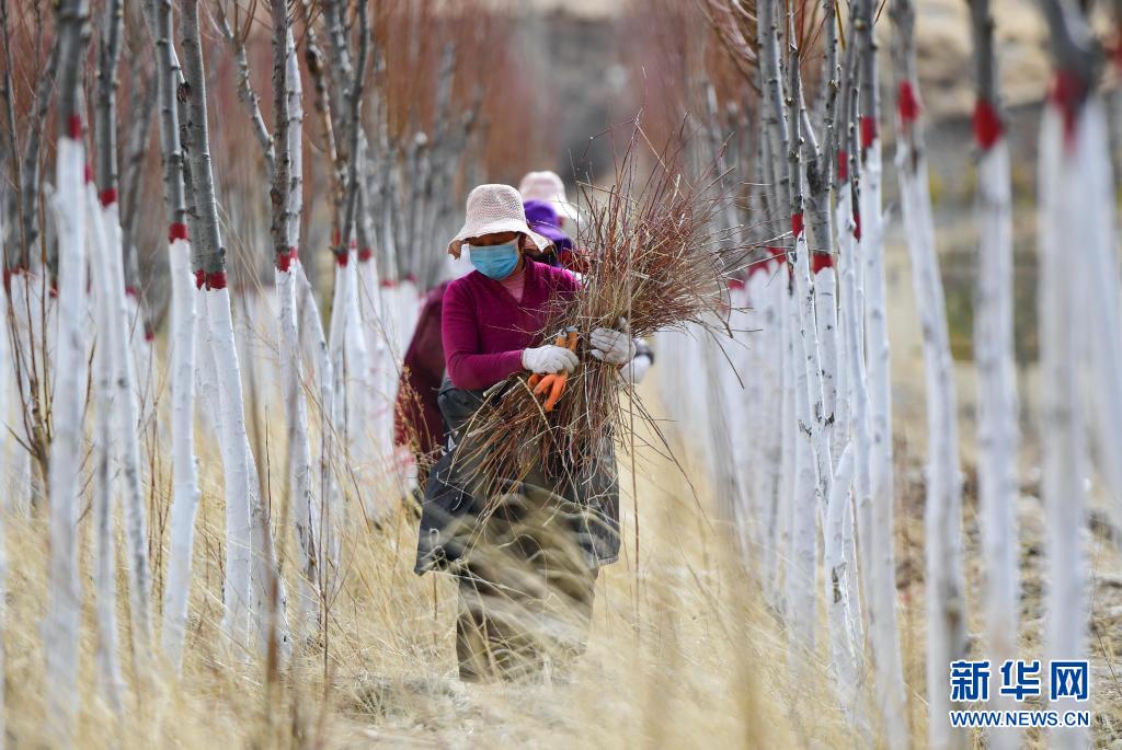 在青海省玉樹(shù)藏族自治州高原千畝林木良種繁育實(shí)驗(yàn)基地,當(dāng)?shù)厝罕娫谇謇硇藜暨^(guò)的樹(shù)枝(2020年3月29日攝)。