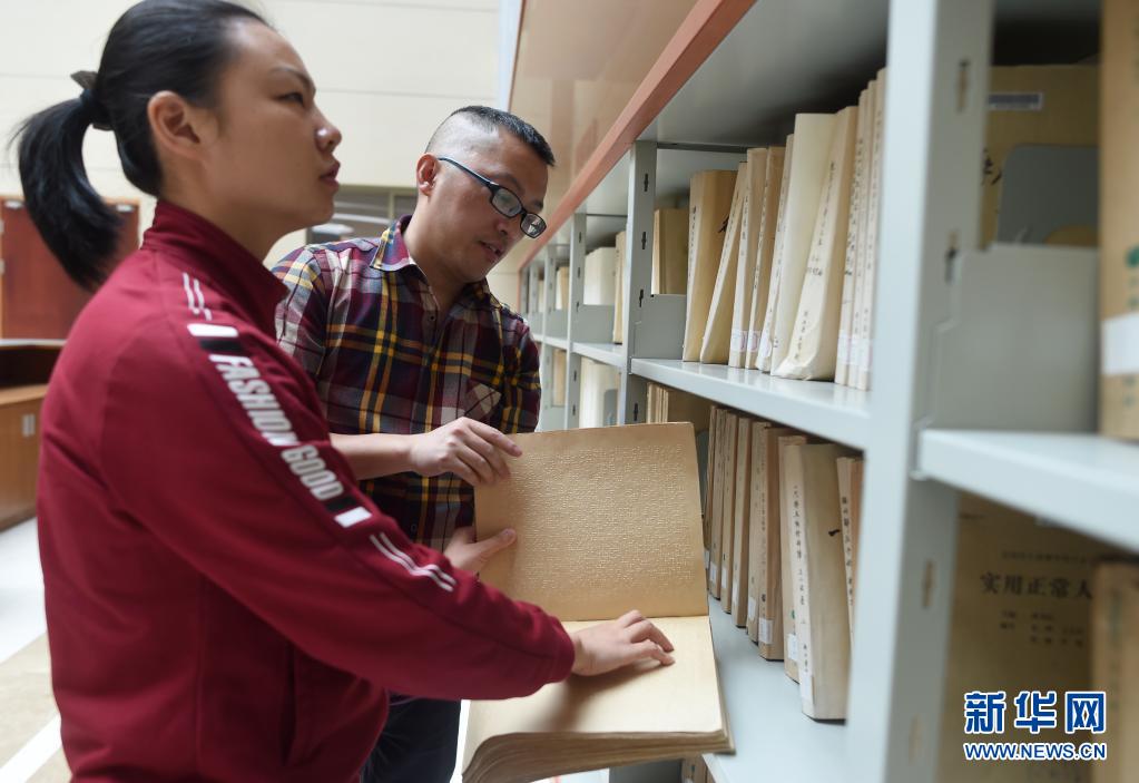 4月28日,龍泉市圖書館工作人員陸軍偉(后)向葉景芬介紹館藏的盲文書籍。新華社記者 韓傳號(hào) 攝