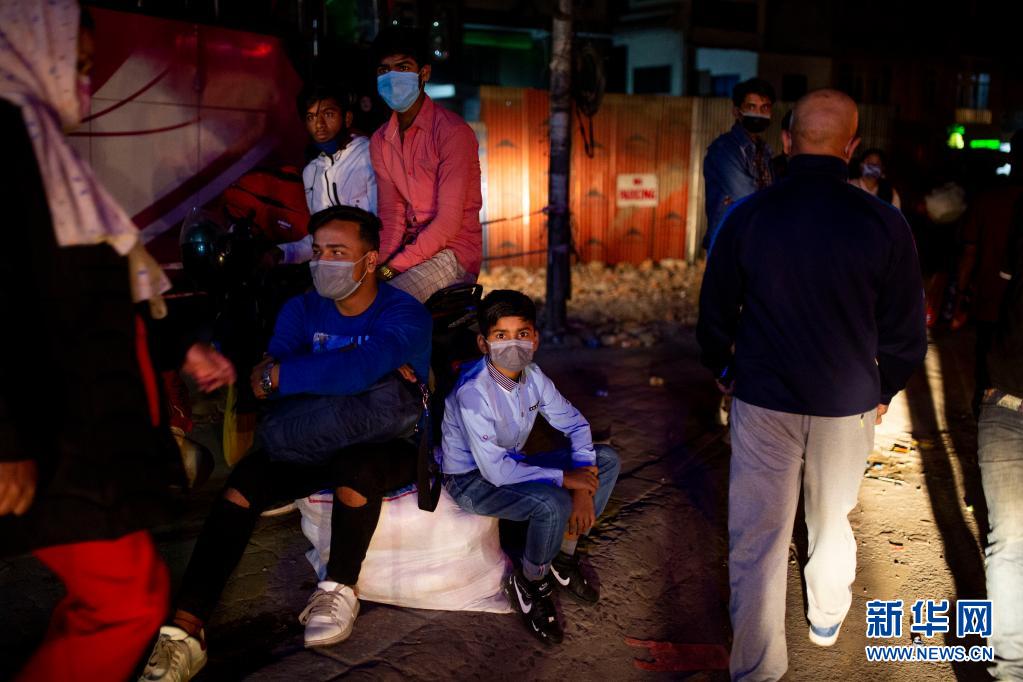 4月28日晚,人們在尼泊爾首都加德滿都的路邊等車,準備在封禁措施實施前離開加德滿都返回家鄉(xiāng)。