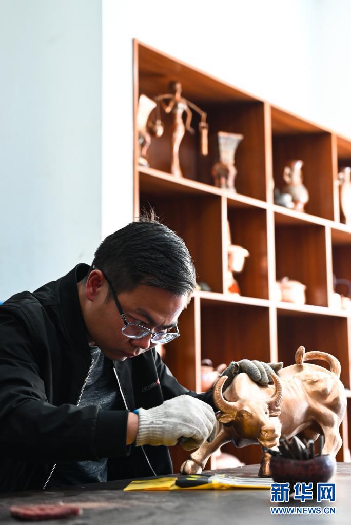 地處滇東北、烏蒙山腹地的云南會澤縣流傳著具有300多年歷史的斑銅制作工藝。斑銅工藝復(fù)雜,要采用高品位的銅為原料,經(jīng)過20余道工序制作而成。產(chǎn)品“妙在有斑,貴在渾厚”,風(fēng)格獨(dú)樹一幟。33歲的張偉是會澤“張氏斑銅”的第十三代傳人。自幼深受地域文化和家庭熏陶的他,大學(xué)畢業(yè)后,返鄉(xiāng)從事斑銅制作工作。在會澤古城的“銅匠街”,張偉創(chuàng)辦了斑銅傳習(xí)館,不斷研發(fā)斑銅新產(chǎn)品、傳承著這項(xiàng)非遺技藝?!鞍咩~是一種情感、一種文化,希望在我們這代人的努力下能夠更好地將它傳承下去,讓更多人了解斑銅的獨(dú)特魅力?!睆垈フf。