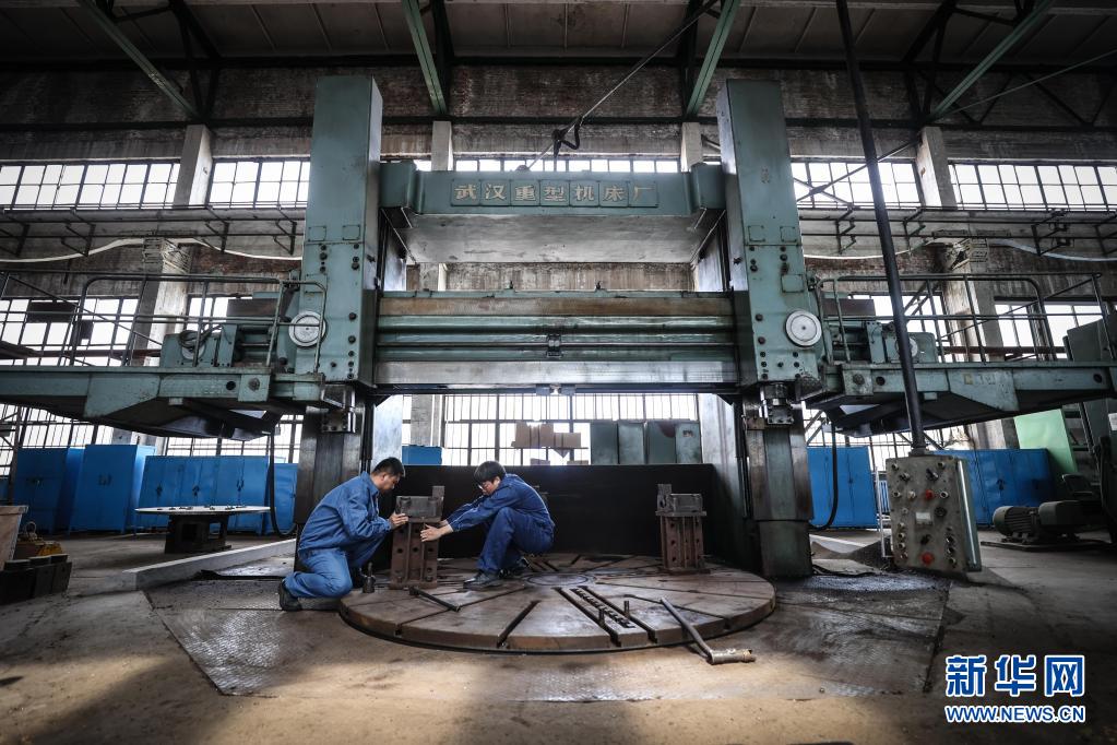 4月30日,王尚典(右)與同事對(duì)機(jī)床進(jìn)行調(diào)整準(zhǔn)備加工配件。